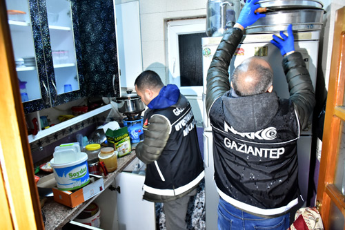 Narkotik dedektör köpeği “Gece”nin de kullanıldığı operasyonda kapıları açılmayan zanlıların evlerine koçbaşı kullanılarak girildi.