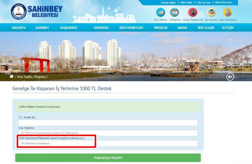 AKP’li Başkan Tahmazoğlu 1000 (bin) liralık para desteğinden faydalanmak isteyen esnaflardan belediyeye ait İnternet sitesinde bulunan forma iban numaraları ile başvurmalarını istedi.