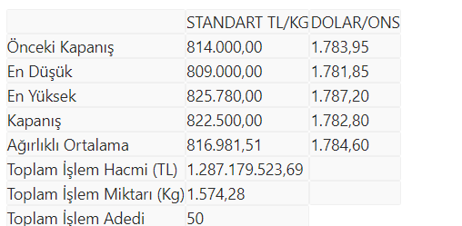 Borsa İstanbul Kıymetli Madenler ve Kıymetli Taşlar Piyasası’nda (KMKTP) standart altının kilogramı 822 bin 500 liraya çıktı.
