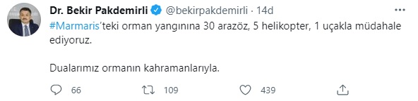 Tarım ve Orman Bakanı Bekir Pakdemirli, kişisel sosyal medya hesabından yaptığı açıklamada, “Marmaris’teki orman yangınına 30 arazöz, 5 helikopter, 1 uçakla müdahale ediyoruz. Dualarımız ormanın kahramanlarıyla.