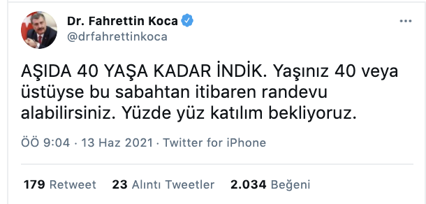 Koca Twitter hesabından yaptığı paylaşımda, “Aşıda 40 yaşa kadar indik. Yaşınız 40 veya üstüyse bu sabahtan itibaren randevu alabilirsiniz. Yüzde yüz katılım bekliyoruz.” ifadesini kullandı.