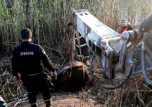 Mahallenin yakınlarındaki bataklığı kontrol eden Taş, ineğinin bataklığa saplandığını fark etti. Uzun uğraşlar vermesine rağmen hayvanı bataklıktan kurtaramayan Taş, itfaiye ekiplerinden yardım istedi.