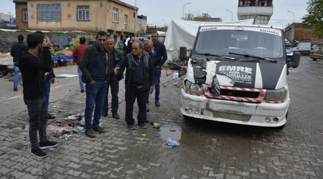 Pazardaki birkaç tezgahı deviren tır, Hasan Kaya’ya ait park halindeki 63 N 6478 plakalı minibüse çarparak durabildi.