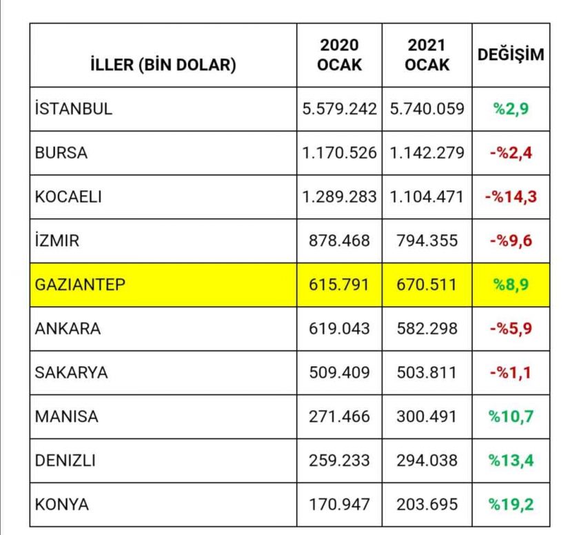 Türkiye İhracatçılar Meclisi (TİM) tarafından açıklanan ocak ayı ihracat rakamları hakkında değerlendirmelerde bulunan Ünverdi, şunları kaydetti: “Ocak ayında en fazla ihracat yapan 10 ilimizden 5’i ihracatını artırmıştır. Konya’nın ihracatı yüzde 19,2, Denizli’nin yüzde 13,4, Manisa’nın yüzde 10,7, Gaziantep’in yüzde 8,9, İstanbul’un ise yüzde 2,9 oranında artmıştır.”