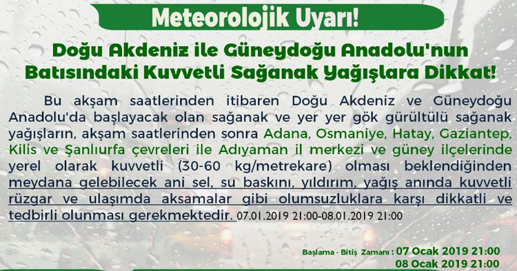 Meteoroloji Genel Müdürlüğü tarafından yapılan açıklamada, bugün akşam saatlerinde Güneydeki bazı il ve ilçelerde aşırı yağıştan dolayı ani sel baskınları olabileceği belirtildi.