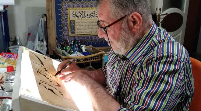İç savaş dolayısıyla ülkelerini terk etmek zorunda kalan Suriyeli Hasna ve Muhyiddin çifti, yarım asırlık hat sanatını mülteci olarak yerleştikleri Gaziantep’te devam ediyor.