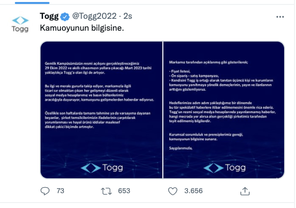“Markamız tarafından açıklanmış gibi gösterilerek, fiyat listesi, ön -sipariş satış kampanyası, kendisini TOGG iş ortağı olarak tanıtan üçüncü kişi ve kurumların kamuoyunu yanıltama yönelik demeçlerinin, yayın ve ilanlarının arttığını gözlemliyoruz. Hedeflerimize adım adım yaklaştığımız bir dönemde bu tür spekülatif haberlere itibar edilmemesini önemle rica ederiz.
